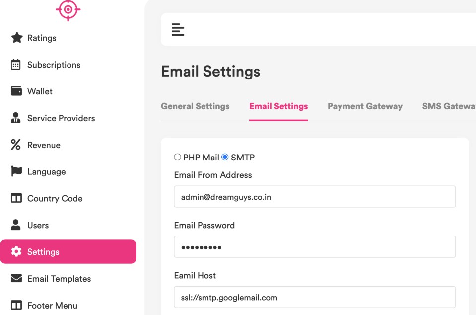 Go to setting and then to ‘Email Settings’ to configure the emails, choose PHP mail or SMTP (SMTP is faster)