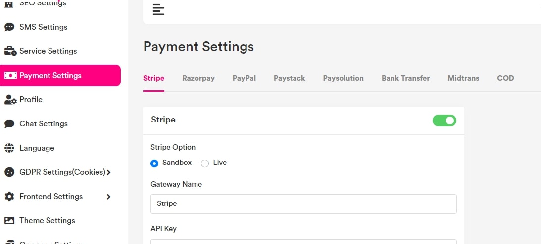 Go to Settings -> Payment Settings ( you have the option to choose, ‘stripe’ and ‘razorpay’ and ‘paypal’ and ‘paystack’ and ‘paysolution’ and ‘midtrans’) you can configure based on your need.